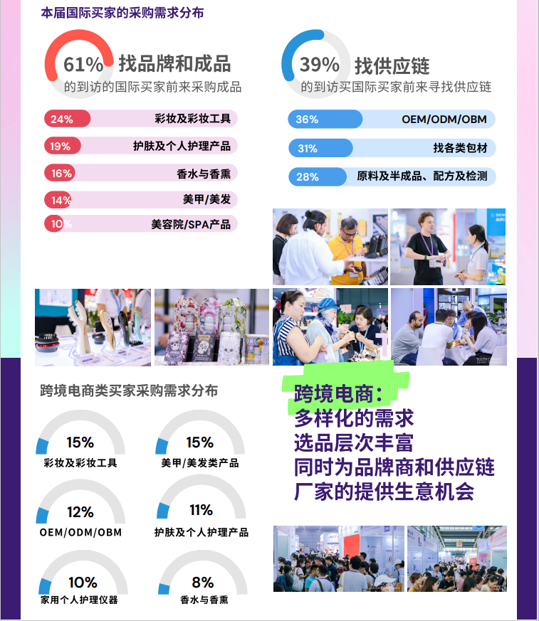 华南国际美博会坚持打造集“消费+科技+时尚”属性的美妆行业盛会,集美妆创新品牌、健康科技、生产供应链、产品设计、贸易于一体的行业盛会。从概念到应用,从产品到品牌,连接消费产业价值链,打造美妆日化消费生态圈,开启未来美妆新想像。