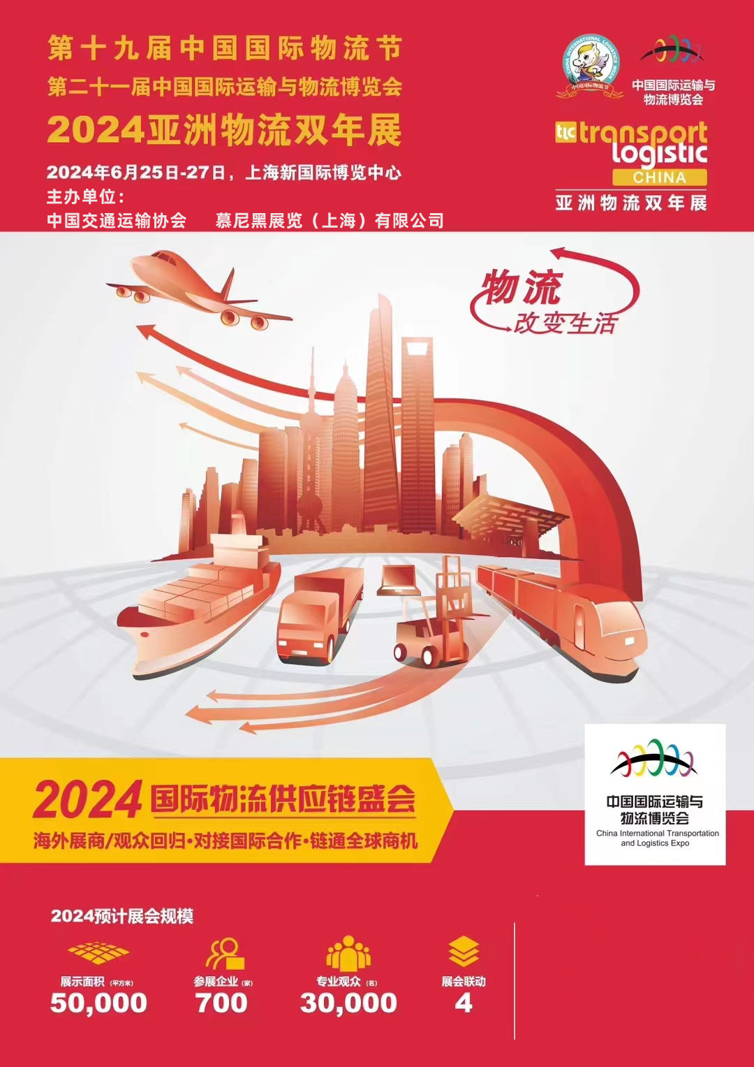 2024亚洲物流双年展将再度联手亚洲生鲜供应链博览会、亚洲航空货运博览会和中国国际物流节暨中国国际运输与物流博览会在上海新国际博览中心同期联袂举办。四展联动,上下游强强联动,优势互补,协同共建覆盖物流各领域的全产业生态圈。