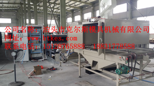 克尔斯自主研发产品全自动彩石金属瓦生产设备。本发明是一种建筑材料生产设备,本设备包括彩石瓦传送带、依次设置在彩石瓦传送带上的一喷胶机构、撒布机构、翻转机构、二喷胶机构,所述一喷胶机构采用具有俯仰角度的链条传动路线,有利于均匀喷胶;所述撒布机构具有使砂石分布均匀的布砂机构,结合翻转机构的作用,使砂石分布较均匀。该彩石金属瓦生产设备结构合理、涂胶和撒砂分布均匀、操作人员劳动强度低,有利于提高产品质量和降低生产成本。