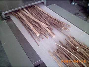 竹制品生产过程中由于工艺流程在生产过程中原材料不一,自然干燥含水率不一样,产品容易变形,开裂,为提高产品质量、降低损耗,提高商品质量,取得经济效益。因而采用先进微波能干燥技术--微波能穿透到物料内部,使物料表里同时产生热能,不会产生外热内冷现象对物品进行干燥,产品进行烘干处理时表面色不变,速度快,效率高;优化工作环境、环保,设备自动化程度高,操作简单,完全可以替代进口设备。