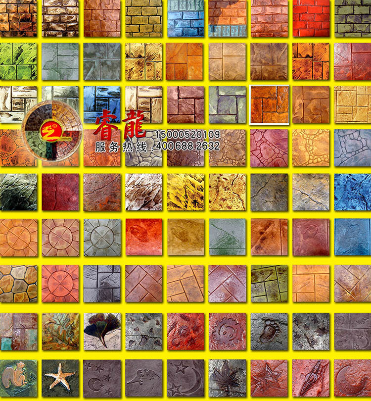 Mats)压嵌入混凝土,混凝土表面以形成各种仿天然的石纹和图案。养护3-5天后用水冲洗并待混凝土面层干燥后,用专用工具将睿龙保护剂(Sealer)喷洒或涂刷在混凝土面层,这样,原本平凡普通的混凝土就会产生各种美观自然、色彩真实持久、质地坚固耐用的砖石、地板、大理石等丰富的纹理效果。
