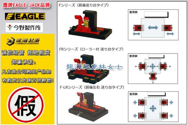 EAGLE带滑台爪式千斤顶,今野制作所千斤顶,分F系列及FR系列,用于设备微调千斤顶,设防过载安全阀,可转动杆座,各个方向操作方便,可定制无尘环境用型号。