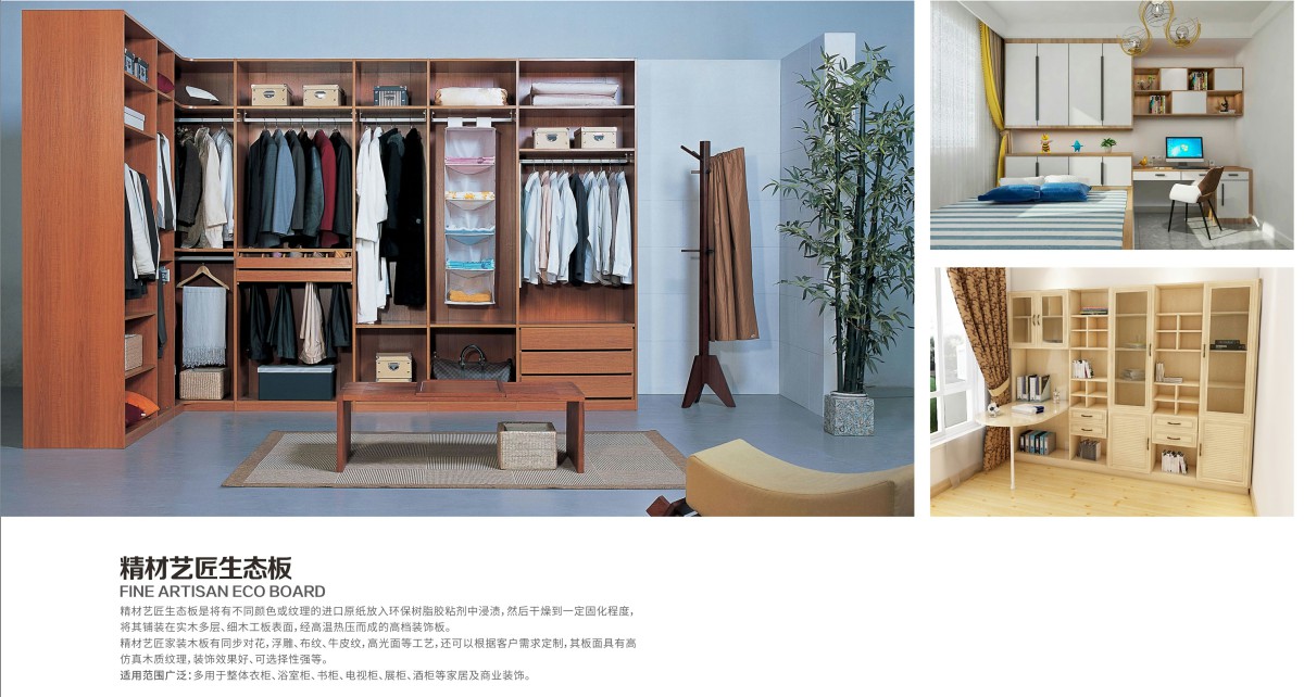 精材艺匠免漆生态板,是将带有不同颜色、图案或纹理的纸放入氨基树脂胶粘剂中浸泡,然后干燥至胶水固化,将其铺装在胶合板、细木工板、防潮板、中密度纤维板或其他硬质纤维板表面,经热压而成的装饰板。具有免漆、耐磨、耐污、防潮抗变形等卓越性能,品质环保,花色丰富时尚可定制,广泛用于家具制造和家庭装修中衣柜、橱柜、鞋柜等制作。
