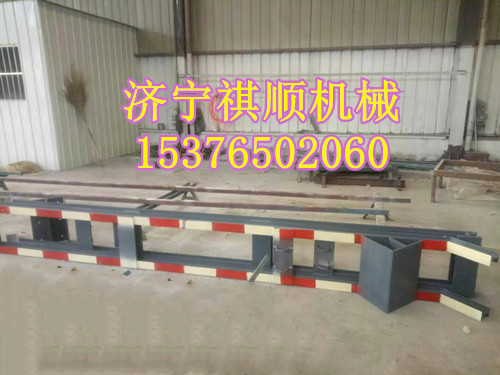 1.挡车梯保险杠由两根12#普工钢焊接而成,梯形保险杠的长度为吊挂高度的1.5-2倍,且当保险杠与绞车侧的道轨行成的角度不大于45度,保险杠宽度为400-500mm,轨距900,宽度为700-800mm,保险杠的横撑采用10#槽钢焊接,间距1米,挡车杠用红白相间颜色油漆均匀涂抹,两种油漆的间距为400mm。