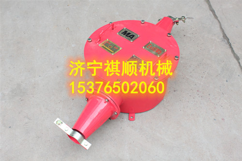 接线盒的隔爆外壳为钢板结构,盖采用螺栓压接形式,两侧为电源引线端,并设有控制线引入装置。壳体内设有三个主接线端子