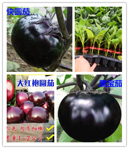 八、大红袍圆茄子苗—紫红皮圆茄,果皮蓝紫中透红,果肉细腻微甜,商品好;果实圆球形或扁圆形,直径15~18cm,单果重1kg。中早熟品种,适合露地覆膜栽培,产量高,喜肥水,抗病强。