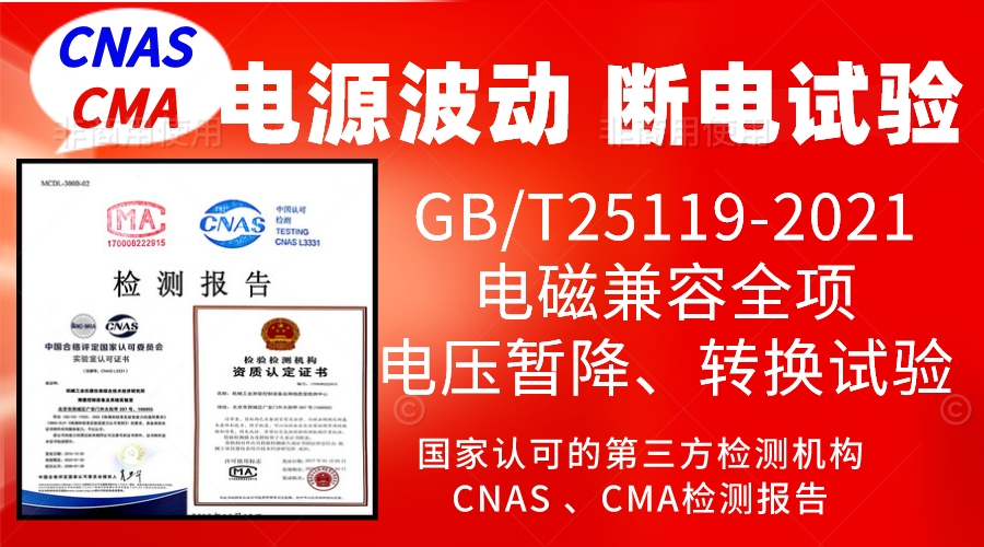 在铁路国家标准GB/T25119-2021《轨道交通机车车辆电子装置》中,规定了机车车辆电子设备的电压波动、断电试验、电源转换、电压暂降及短时中断的产品试验要求,北京仪综所电磁兼容实验室,具备进行这项试验的检测能力,出具CNAS和CMA检测报告、委托型式试验报告和例行试验报告。