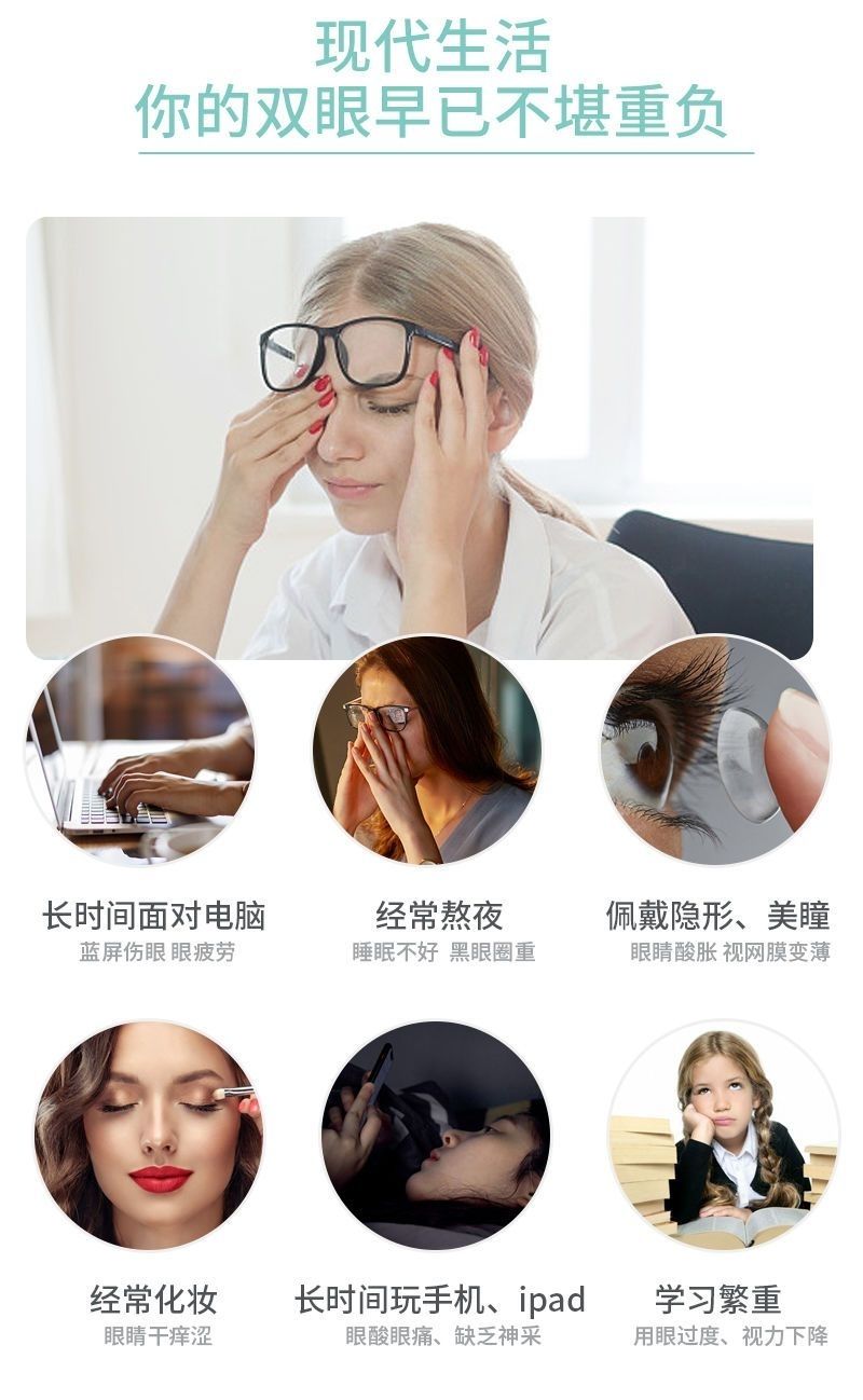 采用先进纳米喷雾科技,对抗各种辐射,有效缓解眼疲劳、红血丝、蓝光辐射、干涩酸胀,给您的眼睛做一次水润按摩