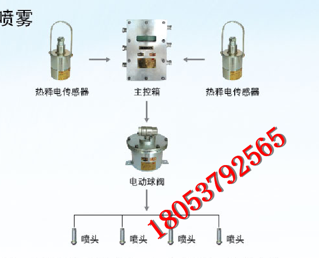 ZP-127Z矿用隔爆兼本安型自动洒水降尘装置主控箱、GUR8矿用本质安全型热释红外传感器、DFH-20/7型矿用本安型电动球阀以及管路喷嘴等。