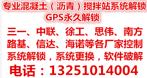 (PLC 工控机 打印 强弱电柜等等),同时本公司也可以承接别的公司的搅拌站控制系统的升级和改造。不论你原是哪个品牌(郑州博特 搅拌站GPS解锁郑州中原电子 搅拌站GPS解锁宝鸡 三衡 郑州晶利电子 郑州科讯 郑州鑫鑫工控搅拌站GPS解锁 郑州志田电子 上海思伟软件 郑州鑫淼 搅拌站GPS解锁洛阳贝尔 洛阳一科 山东博硕 胜乐),哪个厂家的搅拌站(郑州鑫宇 郑州昌利 郑州长城 郑州建新 郑州华鑫 搅拌站GPS解锁郑州恒源 郑州三强 郑州革新 郑州科信 郑州联华 山东方圆 山东天宇 广州佛宇 三一 中联 。。。。)。我们都能提供升级改造服务,保证达到你的要求。专业进口、国产泵车、旋挖钻机、履带吊 搅拌站 塔吊、吊车、挖掘机等移动工程设备GPS解锁gps解密。核心技术无痕迹处理,专业中联泵车GPS解锁 吊车GPS解锁 旋挖钻机GPS解锁