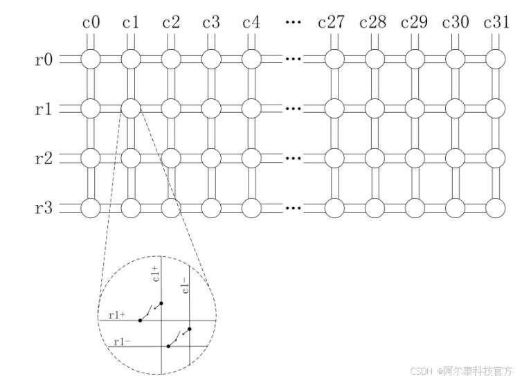 阿尔泰科技公司矩阵卡是一个双线矩阵,即每一条通道实际上是有两条线路,例如 c0 实际上分为 c0+和 c0-,分别可以跟 r0+ 和 r0- 等端口连接。