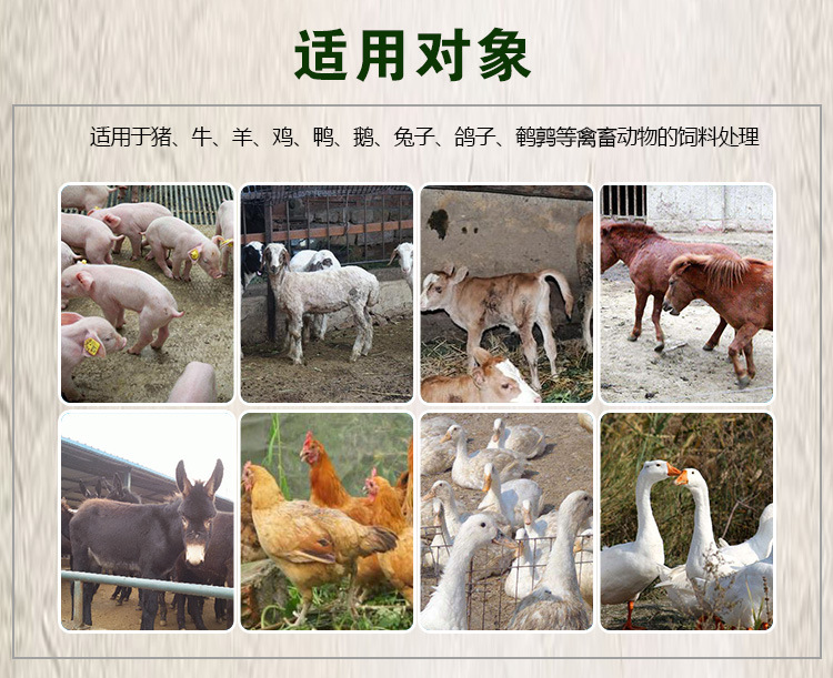 发酵方法: 最简便的方法是自然发酵法,此法可以广泛应用于农副产品和野生饲料,使饲料变得香、甜、软,增加适口性。即将粗饲料粉碎后,用约30℃的温水以1∶1~5的比例与饲料拌后,压紧填装入池,上压重物并封,经5~7天后饲料会发出酵曲香、酒香,即可用来喂畜禽。 或者用微生物发法,其效果优于自然发酵法。首先将粗饲料粉碎,用邦恒复合益生菌液稀释后喷洒到发酵原料上,密封发酵即可,存放时间长,口感好,提供免疫,促进消化。 |