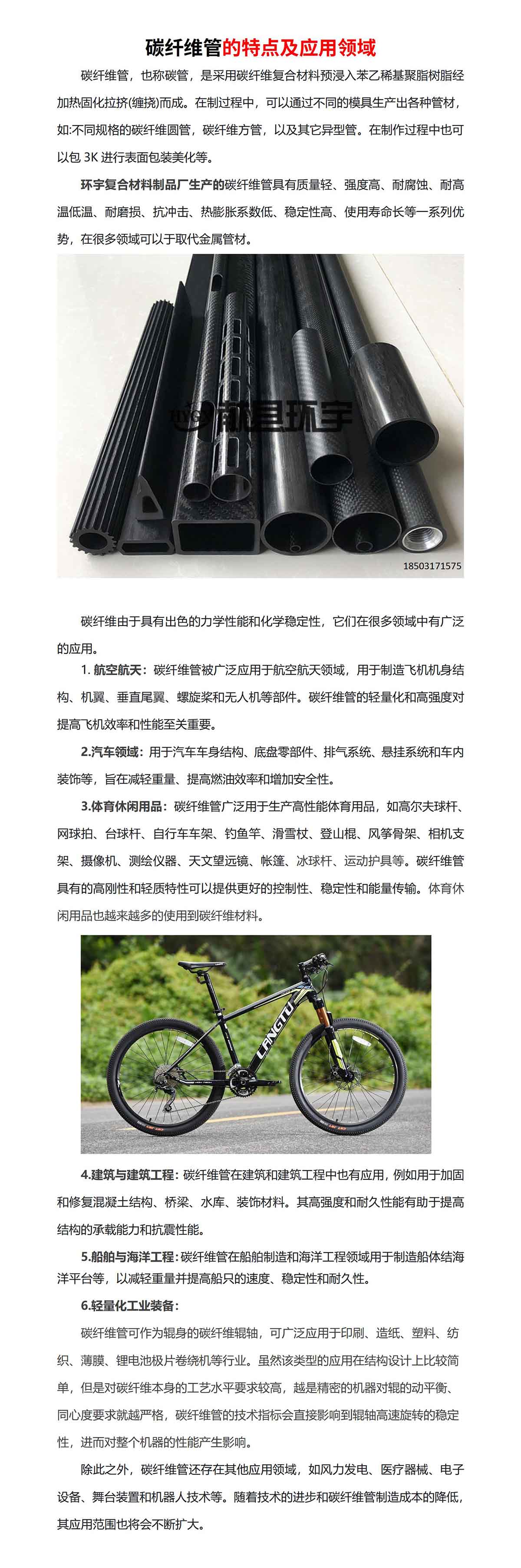 碳纤维管,也称碳管,是采用碳纤维复合材料预浸入苯乙稀基聚脂树脂经加热固化拉挤(缠挠)而成。在制过程中,可以通过不同的模具生产出各种管材,如:不同规格的碳纤维圆管,碳纤维方管,以及其它异型管。在制作过程中也可以包 3K 进行表面包装美化等。