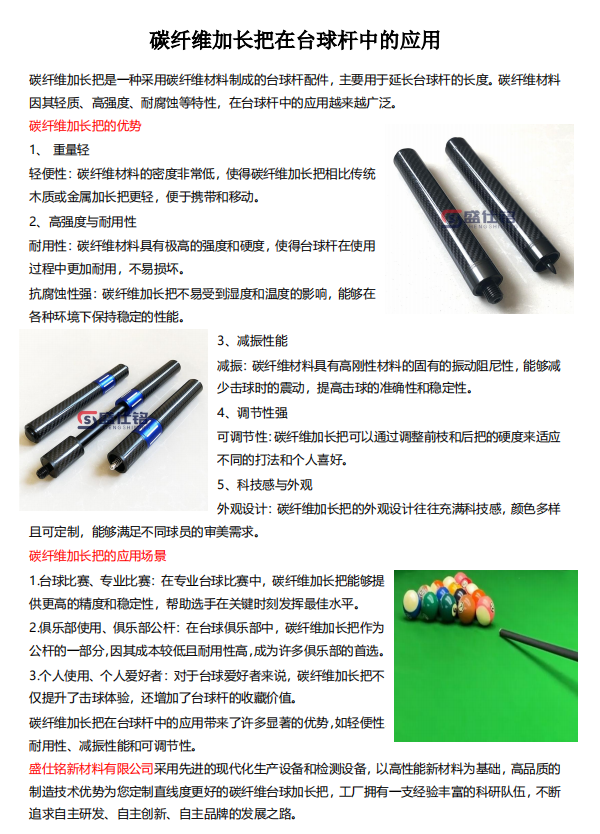 碳纤维加长把是一种采用碳纤维材料制成的台球杆配件,主要用于延长台球杆的长度。碳纤维材料因其轻质、高强度、耐腐蚀等特性,在台球杆中的应用越来越广泛。