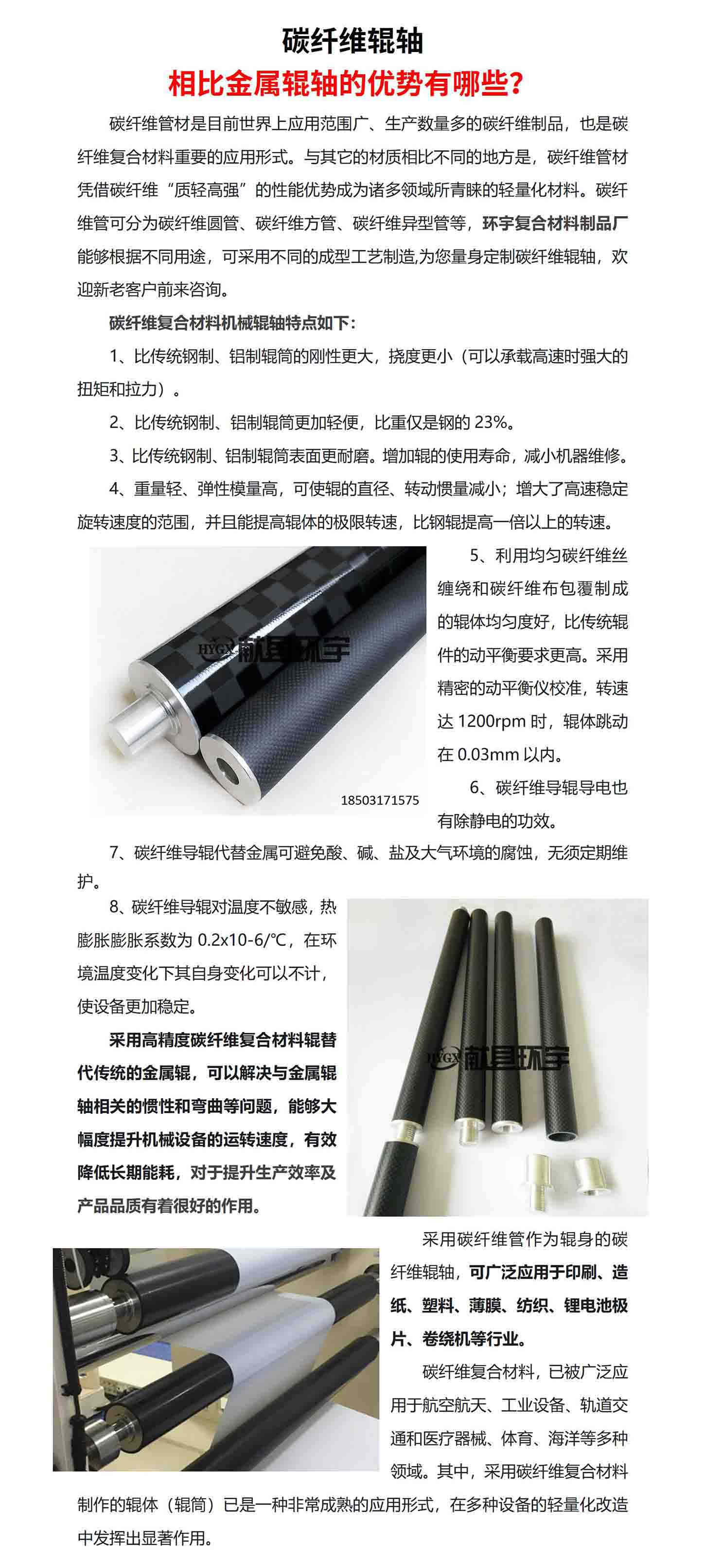 碳纤维管材是目前世界上应用范围广、生产数量多的碳纤维制品,也是碳纤维复合材料重要的应用形式。与其它的材质相比不同的地方是,碳纤维管材凭借碳纤维“质轻高强”的性能优势成为诸多领域所青睐的轻量化材料。碳纤维管可分为碳纤维圆管、碳纤维方管、碳纤维异型管等,环宇复合材料制品厂能够根据不同用途,可采用不同的成型工艺制造,为您量身定制碳纤维辊轴,欢迎新老客户前来咨询。