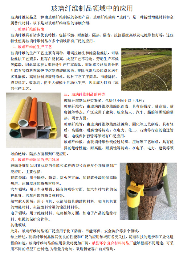 玻璃纤维制品因其优良的性能和广泛的应用领域而备受关注。随着科技的进步和工业化进程的加速,玻璃纤维制品的应用前景将更加广阔。献县环宇复合材料制品厂能够根据不同用途,可采用不同的成型工艺制造,为您量身定制,欢迎新老客户前来咨询。