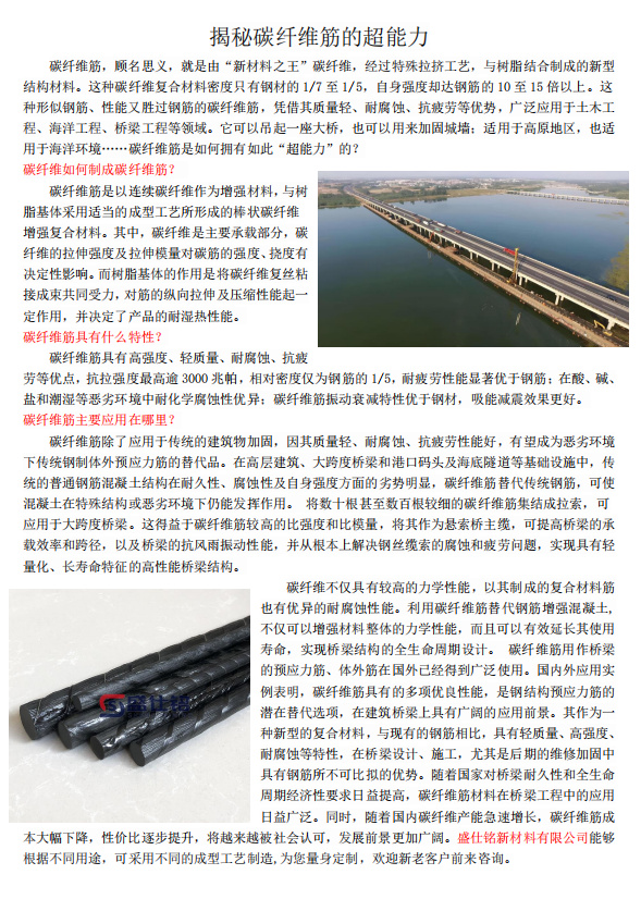 碳纤维筋,顾名思义,就是由“新材料之王”碳纤维,经过特殊拉挤工艺,与树脂结合制成的新型结构材料。这种碳纤维复合材料密度只有钢材的1/7至1/5,自身强度却达钢筋的10至15倍以上。这种形似钢筋、性能又胜过钢筋的碳纤维筋,凭借其质量轻、耐腐蚀、抗疲劳等优势,广泛应用于土木工程、海洋工程、桥梁工程等领域。它可以吊起一座大桥,也可以用来加固城墙;适用于高原地区,也适用于海洋环境……碳纤维筋是如何拥有如此“超能力”的?