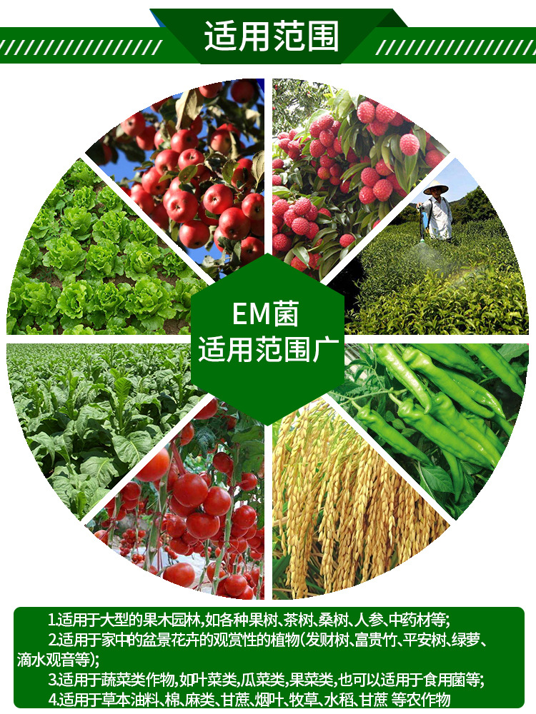 花草壮EM菌的作用: 1、合成氨基酸、糖类、维生素等各种生理活性物质,促进作物生长;增强植物代谢功能,提高光合作用,促进种子发芽,早开花,多结果,提前成熟期; 2、改良土壤性质,促进团粒化结构,提高土壤的保水和透气性能,消除土壤板结;提高土壤肥力,逐渐减少化肥、农药使用量; 3、抑制有害微生物的生存与繁殖,减轻并逐步消除土传病虫害和连作障碍; 4、分解化肥、农药残留,提高产品品质,达到绿色无公害标准; 5、分解大分子有机物,促进根系吸收,提高吸收养分能力; 6、分解有机肥中的重金属,降解有毒、有害物质,防止对土壤和作物的危害; 7、加速粪便腐熟发酵,消除臭味,提高肥效。技术代码20194318237119896 |