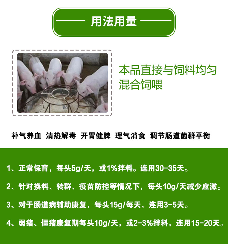 邦恒教保安效果: 1、吃得好:能吃、爱吃、抢着吃,采食量日均增加10-20%。 2、消化好:使用3-5天,粪便外观成型,细腻、柔软;颜色发黑,黄白痢、水样粪减少,粪便腥味不再生成,室内有害气体明显降低,呼吸道病显著减少。 3、睡得好:使用5-7天后,优质睡眠增加1-2个小时,减少了不必要的能量消耗。 4、长得好:连用7-10天,血气两旺,皮红毛亮,两眼有神,无泪斑,总体采食量增加,发病率和用药量减少。 |