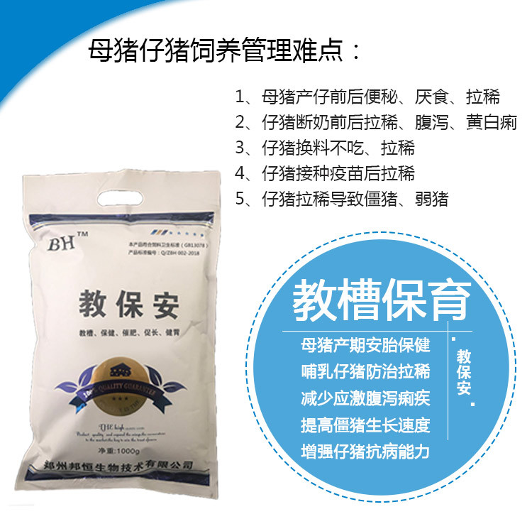 | 通过教保安保健的母猪主要解决:母猪产前产后不食,便秘;仔猪不均匀,产死胎,弱胎等;仔猪初生重、断奶重低下;产后泌乳不足;仔猪黄白痢疾多发,传染性胃肠炎多发,仔猪成活率低等问题。 |