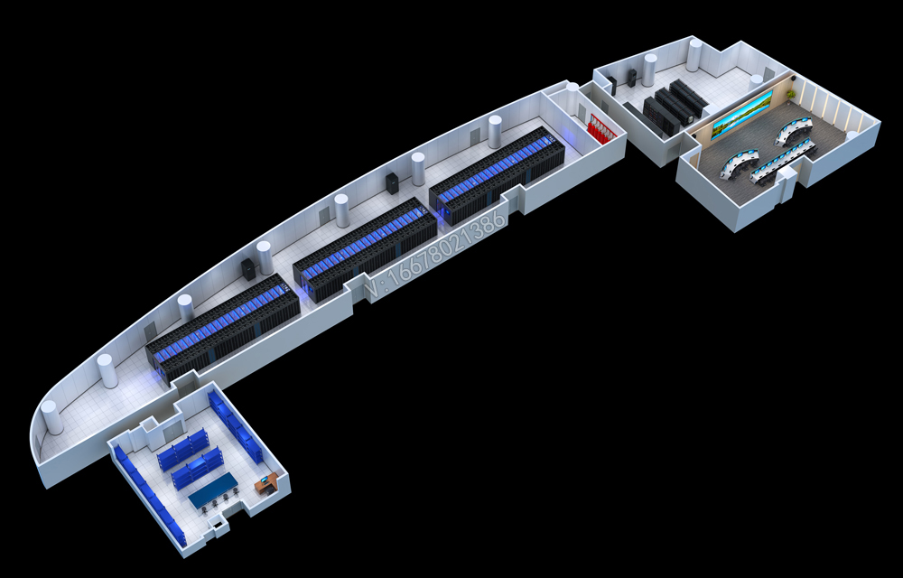 机房全景图是一种可交互旋转操作观看的一种动态效果图,,它可以精确地描述机房的结构、布局、物理设备、环境状况等信息,可以清晰地反映出机房内部的空间结构,以及机房内部的设备布置状况。