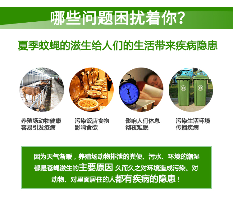 使用技巧: 1、取本品放置于托盘或纸盒中,自然吸引苍蝇进行杀灭。 或者药撒在盆里,盆放高处,既方便、还省事。鸡猪猫狗碰不到,方圆几米的苍蝇会自己来吃,蚊蝇天敌不会吸引十米以外的苍蝇,不用担心别人家的苍蝇来串门。苍蝇跟人的习性很像,早起饿得半死,逮什么吃什么,包括晚上黄昏那会也是饿得很,这两个时间段投放本品合适。即:早晚5-7点是适宜的投药时间。 2、1袋兑水8斤,可喷洒蚊子苍蝇经常出没的地方,喷洒标准为湿而不流为好。 |