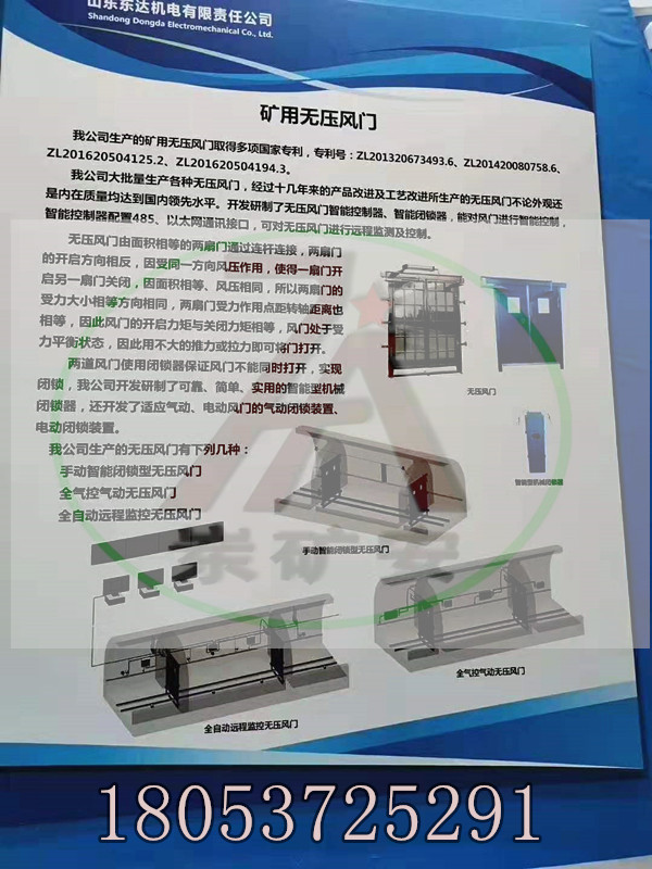 无压风门采用力平衡原理,两道双扇风门,每道风门为双扇钢制门框,异向同步开闭,运用联杆平衡机构转化为一种内力,并得到平衡,保证了风门打开时省力、方便、灵活。煤矿无压风门采用钢制焊接,门扇采用钢板与联杆连接,安装控制系统可实现风门自动开启、闭合。全国热销:18053725291 高品质东达制造厂