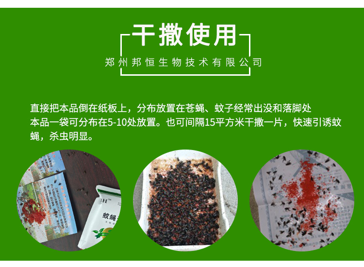 使用技巧: 1、取本品放置于托盘或纸盒中,自然吸引苍蝇进行杀灭。 或者药撒在盆里,盆放高处,既方便、还省事。鸡猪猫狗碰不到,方圆几米的苍蝇会自己来吃,蚊蝇天敌不会吸引十米以外的苍蝇,不用担心别人家的苍蝇来串门。苍蝇跟人的习性很像,早起饿得半死,逮什么吃什么,包括晚上黄昏那会也是饿得很,这两个时间段投放本品合适。即:早晚5-7点是适宜的投药时间。 2、1袋兑水8斤,可喷洒蚊子苍蝇经常出没的地方,喷洒标准为湿而不流为好。 |