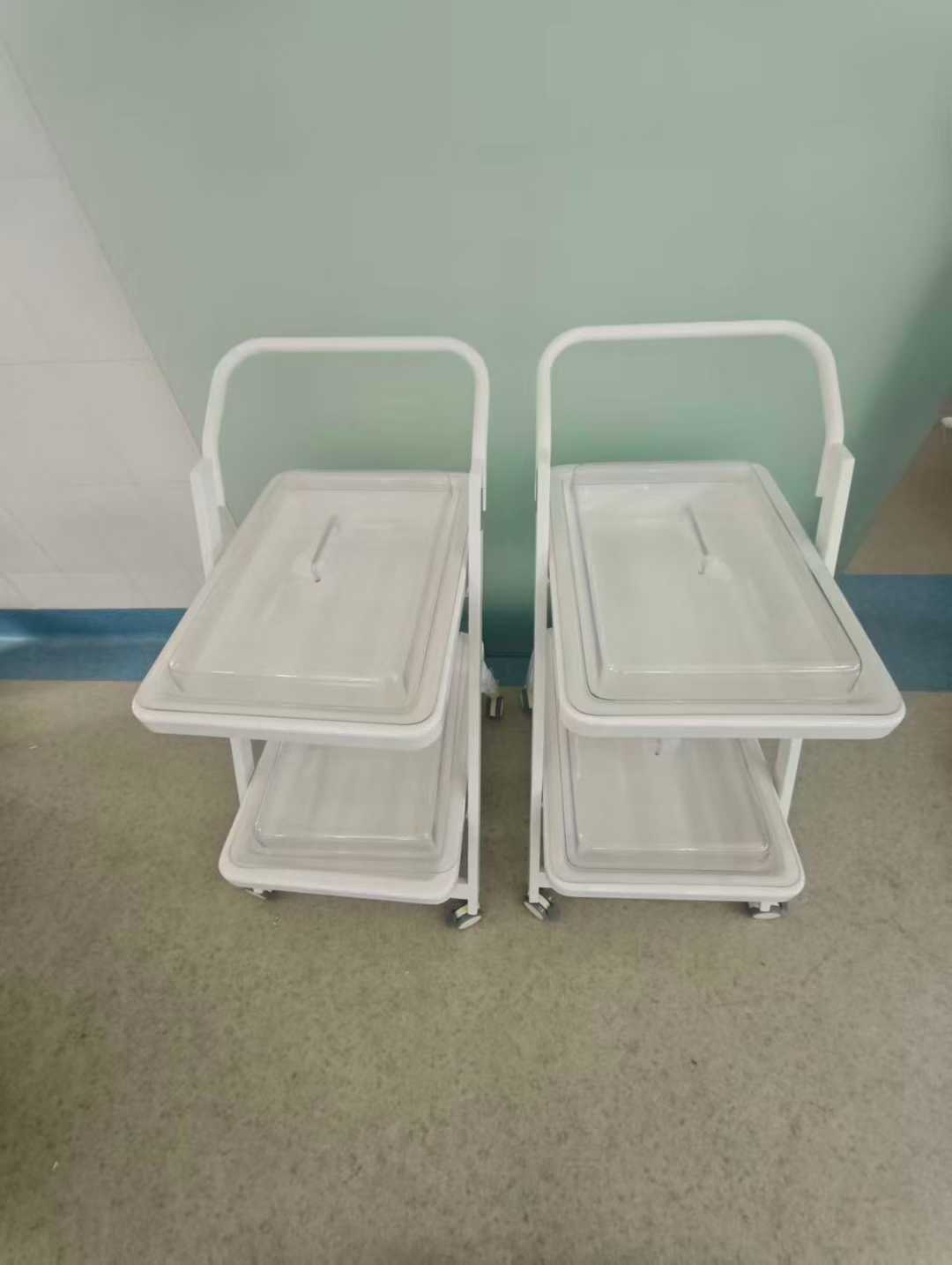 小推车二层、三层独立式设计,周转盘材料由高分子复合材料独立开模制成,车体由钢体喷塑而成,具有耐腐蚀、不沾水、车行顺畅、取放方便等优点。盘内内镜存放导航隔条使污染部分分离。多层设计使客户在使用过程中可将清洁和污染的内镜分层标明后置放,可达到高效周转,避免交叉感染等功效。