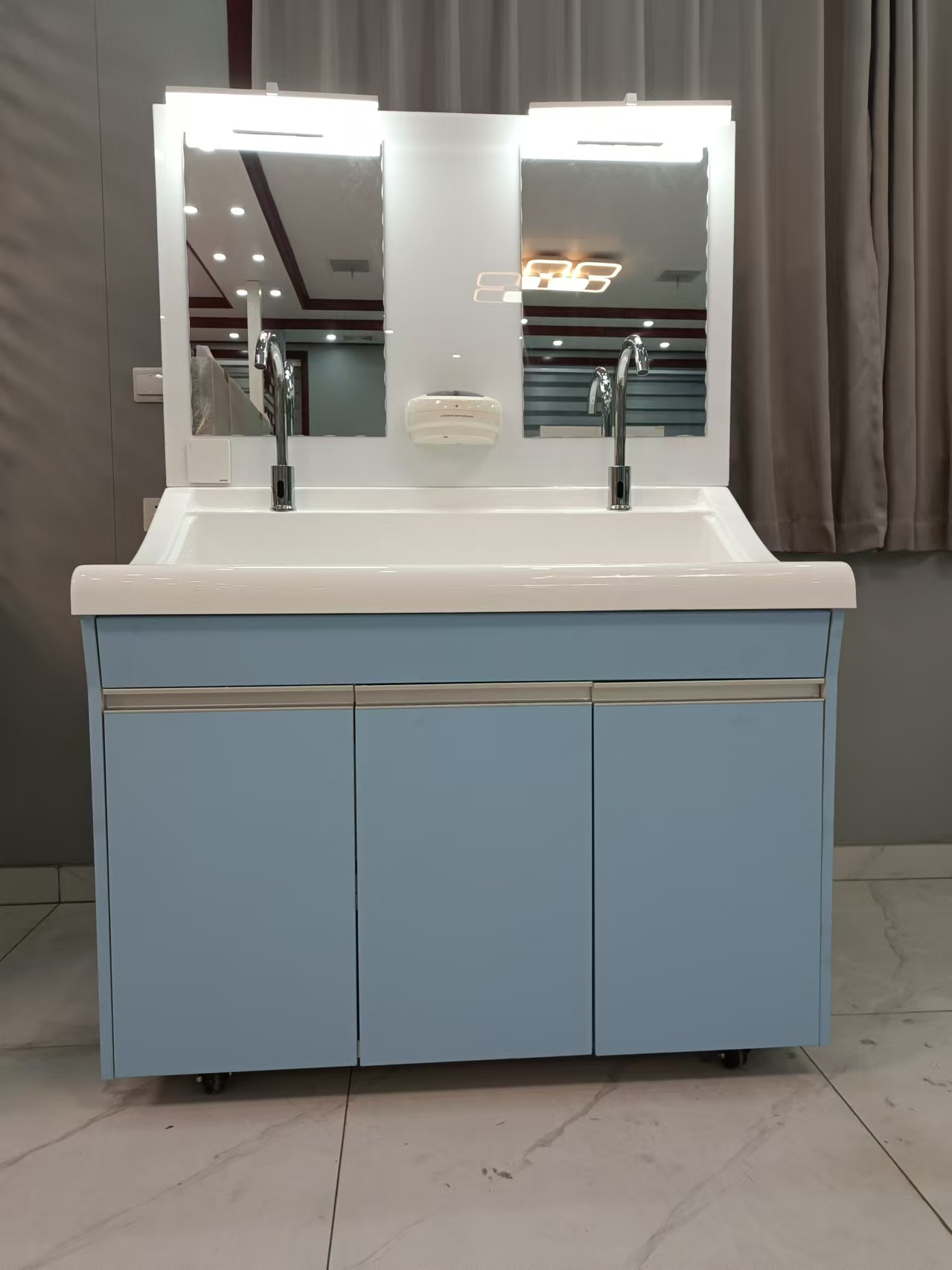 高分子洗手池材质特点:采用高分子材料一次吸塑成型,出水方式有:感应式、膝控式、脚踏式和手动开关,一台洗手池可客户要求选择单一出水方式或多种出水方式。洗手池分高背和低背,高背总高度1800mm,配有美容镜,照明灯,皂液器,可按客户要求配置烘手器和热水器。低背板无配置。