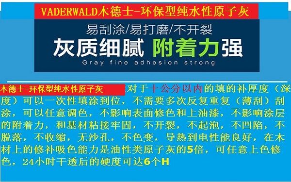 VADERWALD木德士-环保型水性原子灰为纯水性环保产品,A型为~水性纳米可填色型高分子网状纤维(粉状),固化剂B型为~纯水性高分子膨化型交联发生剂(液态),两者皆为纯水性,无VOCS,没有有机溶剂,没有有害物质,绿色环保;阻燃不怕火,阻燃级别B1,AB剂混合所发生的固化反应~属交联交叉自结晶反应;不产生热量和气体流出,故可以对于十公分以内的填补厚度(深度)进行填涂,不需要多次反复重复(薄刮)刮涂。干透后不影响涂层的附着力,在木材上的修补吸色能力是油性类原子灰的3-5倍,干透后的硬度可达6个H。其具有常温固化、干燥速度快、易涂刮、不易起皮、不易色变、不易凹陷、不易脱粉、不易开裂、不易收缩、延伸性好、透气性好、易打磨抛光、附着力强、施工简便、被涂表面光滑、和基材粘接牢固、导热到电性能良好等一系列优点。常温下VADERWALD木德士-环保型水性原子灰A B剂混合后十-二十分钟内表干(冬季半小时-四十分钟)即可进行堆放叠加处理,不需加热干燥,节省工序,缩短流程时间,主要适用于修补木地板,大板,家具的结疤,缺料,凹坑以及较大尺寸的裂缝。