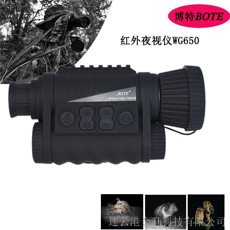 BOTE(博特)自由者多功能数码拍照夜视仪RG650 500万像素 高清六合一红外数码拍照摄像夜视仪=红外夜视仪+红外数码相机+红外摄像机+远距离实时红外监控网络摄像机+USB移动硬盘+单筒数码望远镜 BOTE(博特)自由者多功能夜视仪RG650具备了高清六合一红外数码拍照摄像夜视仪=红外夜视仪+红外数码相机+红外摄像机+远距离实时红外监控网络摄像机+USB移动硬盘+单筒数码望远镜,A.白天可以当数码望远镜使用可以拍出高清的彩色照片,6倍放大镜头补捉目标,所见即所得,看清就可以拍清图片,500万像素,内置 1.5”彩色液晶显示屏,高清720P录像。B.夜晚是当夜视仪使用,因为是数码夜视仪所以夜晚成像为黑白色,全黑无光观察距离350米内可观,支持32G的TF卡扩卡。