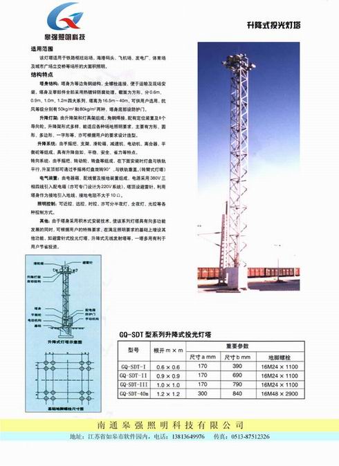南通皋强照明科技有限公司专业生产照明灯具,升降式投光灯塔、灯桥、可倾式灯杆、升降式高杆灯、路灯、庭院灯、太阳能灯、工矿灯、隧道灯(标志灯)、电缆挂架等室内外照明产品,专业为铁路、电厂、港口、煤场、及市政照明服务,可根据客户需求及TB2865-1997量身定制,联系人:沈尉,联系电话:13813649976.,商务QQ:785859970,
