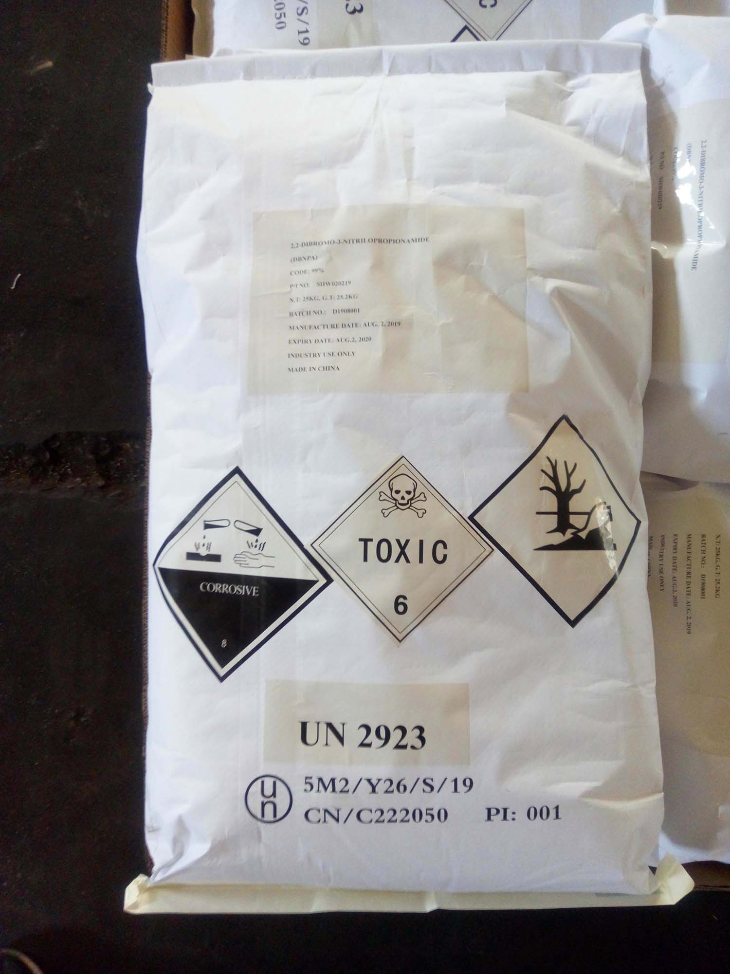 性状:DBNPA为白色结晶粉末,溶点125oC。可溶于聚乙二醇、苯、乙醇等有机溶剂,略溶于水,其水溶液在酸性条件下,较为稳定,在碱性条件下易分解,同时在硫化氢等作用下易分解。储存于室内通风阴凉处,储存期二年。