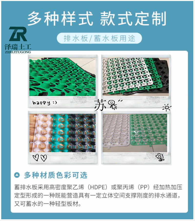 泽瑞厂家排水板、蓄排水板、网格、土工布生产设备全,免费寄样品,按照样品订货生产收货,让每一位客户放心购买,施工省心。青岛2公分蓄排水板、青岛2.5公分蓄排水板、青岛3公分蓄排水板、青岛4公分蓄排水板、青岛5公分蓄排水板,规格全,颜色全,施工简单搭接方便。183“5387”7611苏经理