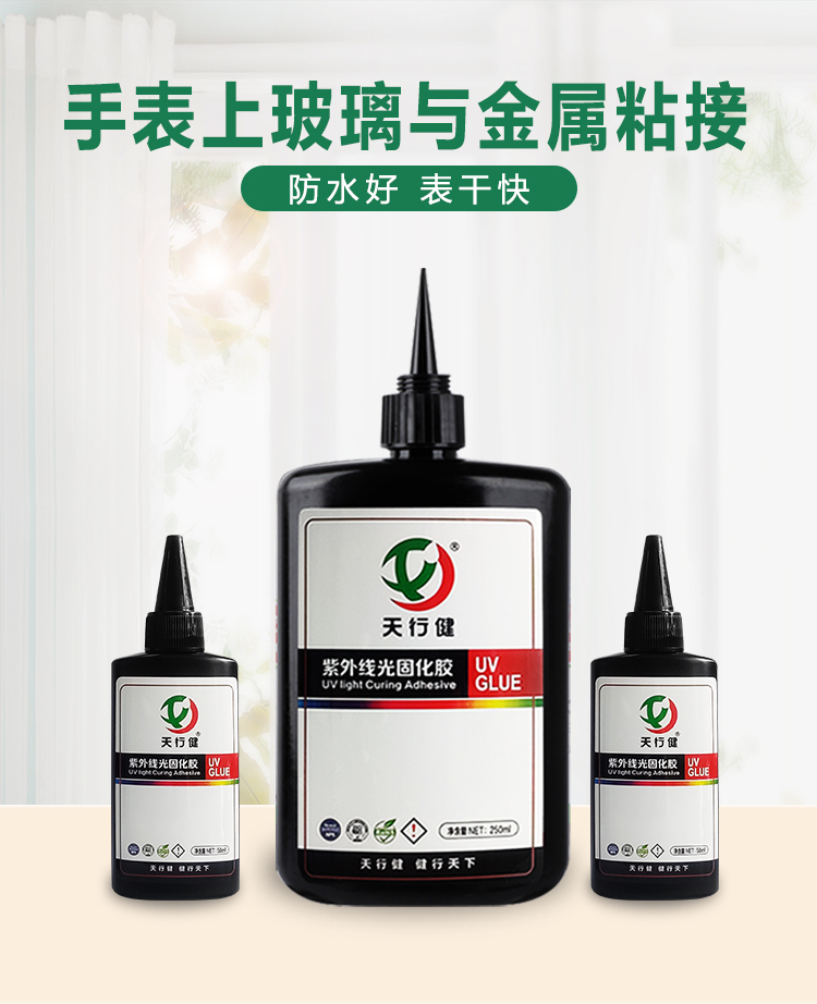产品特点:高强度紫外光固化丙烯酸酯类胶粘剂。对玻璃、水晶与金属具有非常很好的粘接效果,通用性佳,气味低,耐黄变性好及稳定性好。中高粘度,适用于手表上玻璃与金属的粘接,而且防水和表干效果好。