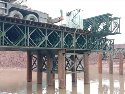 5)贝雷片可用于公路桥梁,拼装龙门吊车,导梁,架桥机,吊篮等。贝雷桁架组合门式起重机,采用钢便桥构件拼装龙门架,而且其跨距与立柱高度可调,以适应不同的工作场地,普遍应用于公路、铁路、市政、建筑、水利等建设项目、桥梁施工预制场起吊移运预制构件、桥墩旁运装大梁等现场施工作业。