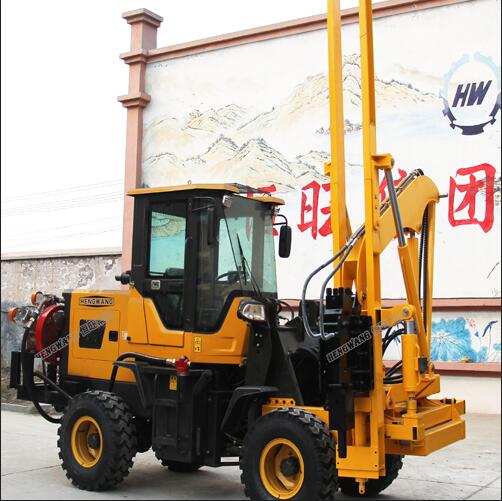 装载机式护栏打桩机是恒旺集团根据市场需求和自身技术成熟的情况下面向客户需求而研发的一款产品,是集装载、打桩、钻孔等功能为一体的新型产品。采用全新设计理念、精心研制整体功能,结构模块化兼顾的设计思想,全封闭各木式安装结构,更利于产品快速安装和转场,可广泛运用于公路、李速等路面护栏的桩孔钻进工作。