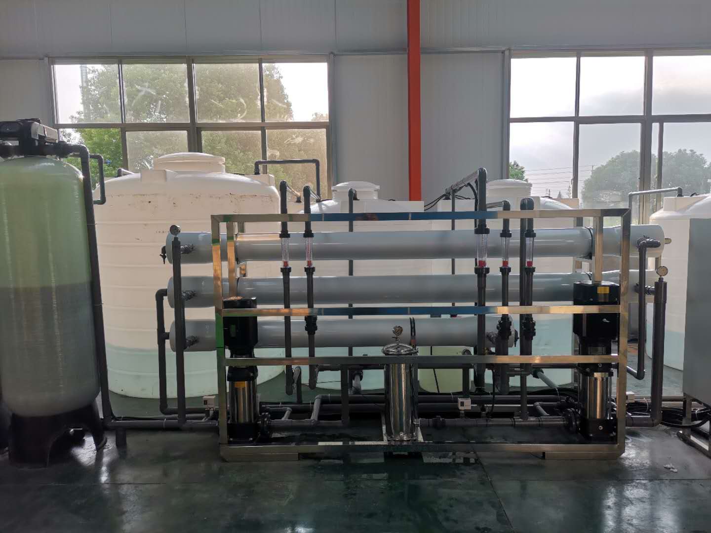 反渗透设备的预处理常常由石英砂过滤装置、活性炭装置、精密过滤装置组成,主要目的是去除原水中含有的泥沙、铁锈、胶体物质、悬浮物,色素、异味、生化有机物,降低水中的余氨值及农药污染等有害的物质。如果原水中钙镁离子含量较高时,还需增加软水装置,主要目的在于保护后级的反渗透膜不受大颗粒物质的破坏,从而延长反渗透膜的使用寿命。