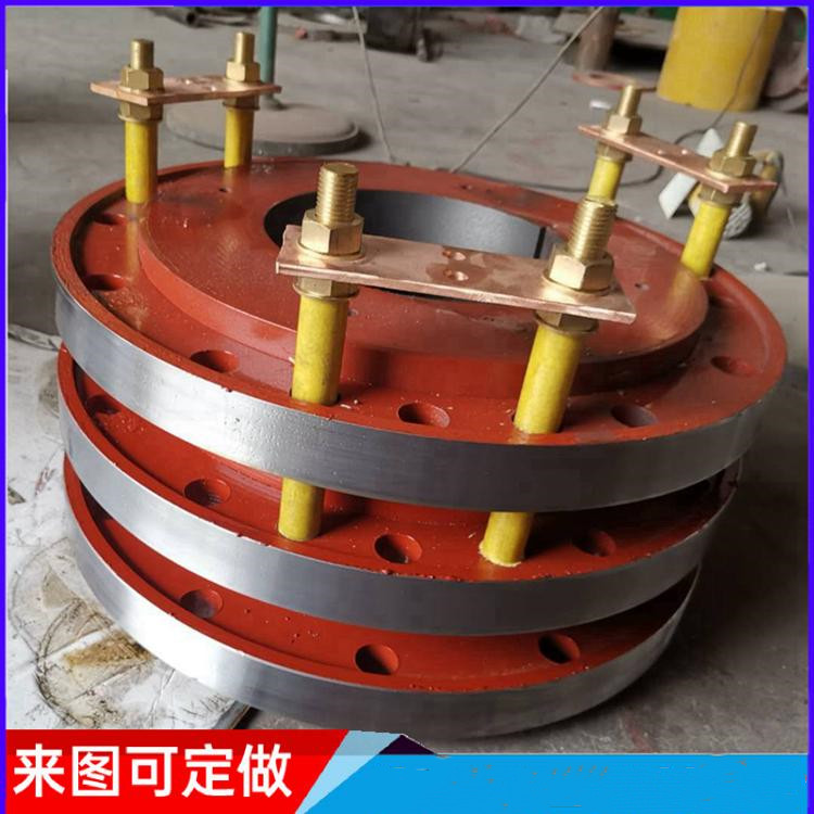 高压电机集电环YRKK1000-8兰州电机厂电机滑环华海厂家,导电滑环属于电接触滑动连接应用范畴,它又称集电环、或称旋转关节、旋转电气接口、滑环、集流环、回流环、线圈、换向器、转接器,是实现两个相对转动机构的图像、数据信号及动力传递的精密输电装置。特别适合应用于无限制的连续旋转,同时又需要从固定位置到旋转位置传送功率或数据的场所。集电环系列同步电机和异步电动机等采用集电环的电机,比较广泛地用于产业部门,而且,多数是在各种苛刻条件下运行的。这些电机虽然没有直流电机那样的换向作用,但与换向器一样,也出现集电环或电刷的异常磨损,电刷振动以及产生火花等弊病。特别从电刷材质来看,集电环用电刷不仅使用石墨电刷,而且为了提高电刷的电流密度,有时也使用金属石墨电刷,所以,还必须考虑异常残余膨胀等因素。即使对于汽轮发电机那样的高速电机或在全封闭气体介质和氢气介质中运行的电机,问题也不少。集电环的材质要求机械强度大,并是电的良导体,还要具有耐腐蚀性,在与电刷滑动接触时,必须具备耐磨性和稳定的滑动接触特性。一般,钢质集电环的耐磨性好,机械强度大,因此大多用于因极性引起集电环磨损差较大的同步电机上。