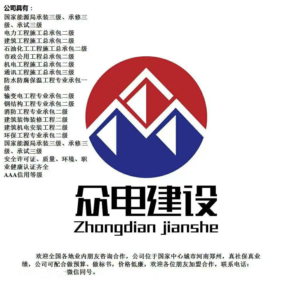 众电建设集团拥有丰富的资质资,拥有电力施工总承包三级,市政工程总承包三级、市政公用工程施工总承包二级、建筑工程施工总承包二级、房建工程总承包三级、机电工程总承包三级、消防设施工程专业承包二级、**能源局承装三级、承修三级、承试三级。电力工程施工总承包二级,石油化工工程施工总承包二级,市政公用工程总承包二级,机电工程施工总承包二级,通讯工程施工总承包三级,防水防腐保温工程专业承包一级,钢结构工程专业承包二级,建筑装饰装修工程二级,环保工程专业承包二级,安全许可证、质量、环境、职业健康认证齐全,AAA信用等级。
