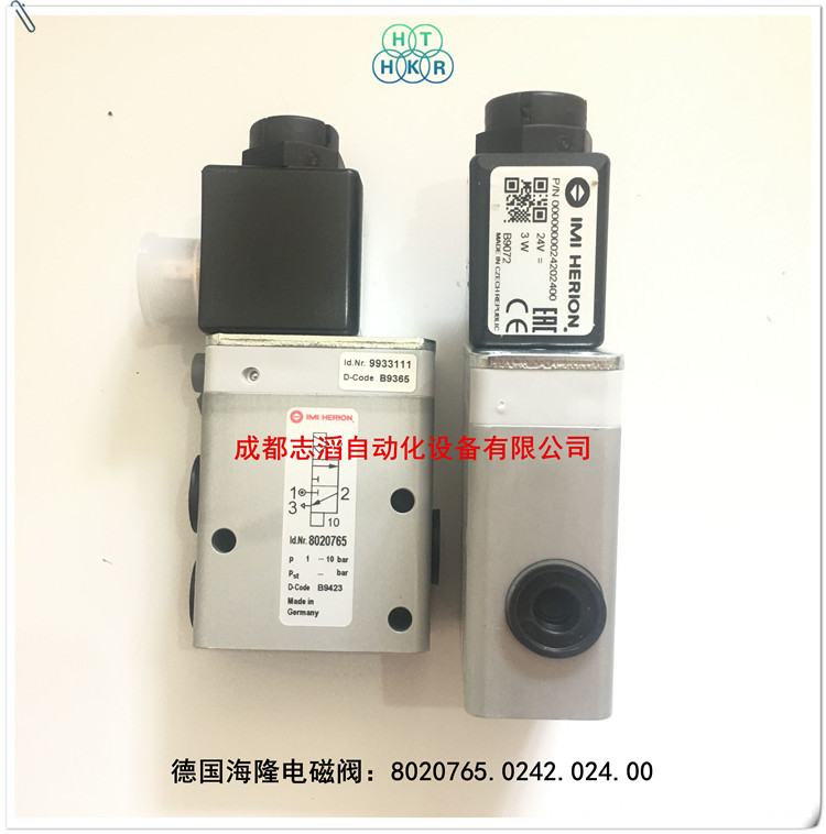 8020765.0242.024.00德国海隆(IMI HERION)电磁阀技术参数:接口尺寸G1/4、工作压力1-10bar、流量1200l/min、响应时间35ms、阀体重量04kg、配海隆普通线圈0242(功率为3W、防护等级IP65、环境及流体温度范围-25到80摄氏度、电气连接为175301-803A型)、线圈电压为24V直流、阀体产地为德国、线圈产地为捷克!
