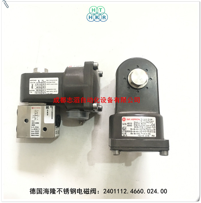 2401112.4660.024.00德国海隆(herion)不锈钢防爆电磁阀技术参数简介:接口尺寸1/4NPT、工作压力0-10bar、阀座密封件材料NBR、配4660.024.00(线圈功率损耗4W、线圈电流162ma、防护类别II2G,II2D、防护等级EEx md IIC T4/T6 EEx me IIC T4/T6 IP66 t130摄氏度、电气接口1/2NPT、环境及立体温度-40到80摄氏度、线圈重量0.8kg)的防爆线圈!