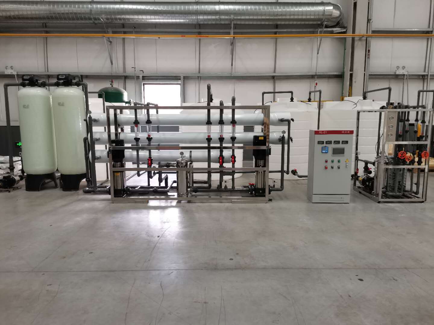 电池行业用超纯水包括蓄电池生产用纯水,锂电池生产用纯水 ,太阳能电池生产用纯水,蓄电池格板用纯水。电池中电解液的配备对纯水要求十分严格, 通常要求水的电导率在0.1us/cm(电阻值在10兆欧姆)以上,传统用来制备电池用超纯水的工艺是常采用阴阳树脂交换设备,该工艺的缺点在于树脂在使用一段时间以后要经常再生。随着膜分离技术的不断成熟,现在常常采用反渗透过滤工艺,或者是采用一级反渗透后面再经过离子交换混床(或电去离子edi)工艺来制取超纯水。