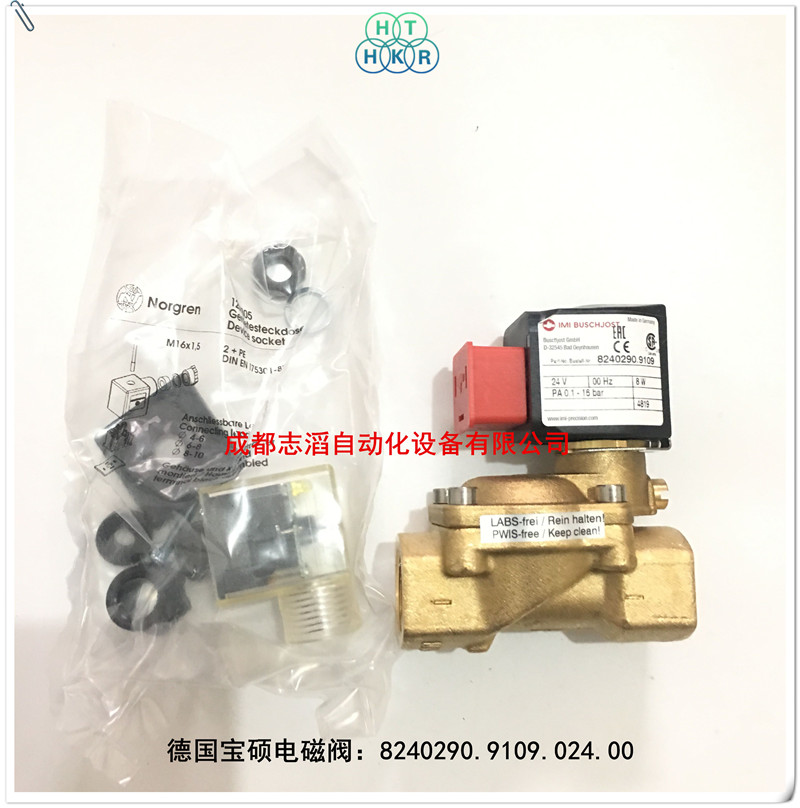 8240290.9109.024.00德国宝硕(IMI BUSCHJOST)隔膜阀技术参数:流通通径12mm、接口尺寸G1/2、工作压力0.1-16bar、Kv值为3.8立方米/小时、阀体重量为0.5kg、配宝硕普通线圈9109(线圈电压为24V直流、线圈功率为8W、防护等级IP65、环境温度-25到50摄氏度、流通温度可达110摄氏度)、产地为德国、应用在汽车自动化生产线流通控制!