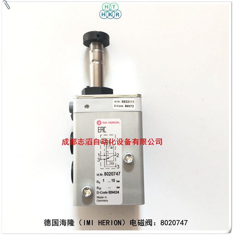8020747.0000.000.00德国海隆(IMI HERION)电磁阀技术参数简介:功能为2位3通、接口尺寸1,2为G1/4,3和4为法兰、工作压力-启动压力为1bar,可达10bar、流量为1200l/min、切换时间为35ms、手动应急控制为按下并锁定、阀体重量为0.24kg、环境温度范围-10到60摄氏度、安装为任意,建议电磁线圈置于顶部、介质为经过滤的润滑或非润滑压缩空气、工作方式为先导电磁控制-滑阀、阀体材料为阳极氧化铝、密封件为NBR、产地为德国!