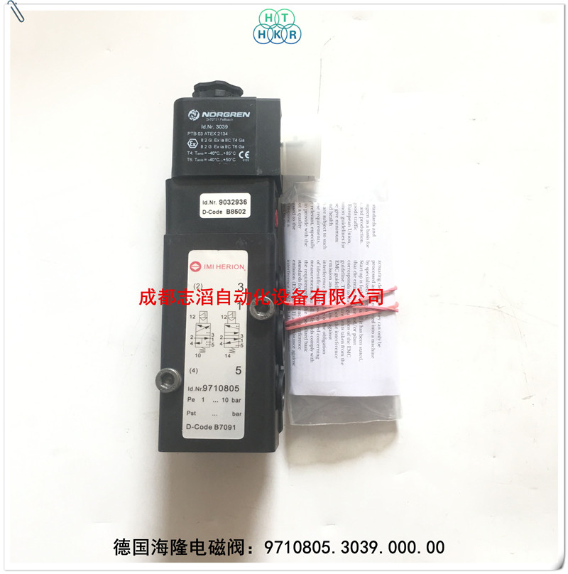 9710805.3039.000.00德国海隆(IMI HERION)本安电磁阀技术参数:接口尺寸1为1/4NPT,3(5)为1/8产地德国、纳姆电磁阀、配海隆线圈本安3039(线圈标称阻值275欧姆、切换电流37MA、线圈阻值RW50为330欧姆、终端电压RW60为13.7V、环境温度-40到50摄氏度、流体温度50摄氏度、线圈重量为0.83kg、产地捷克)、应用行业阀门生产控制
