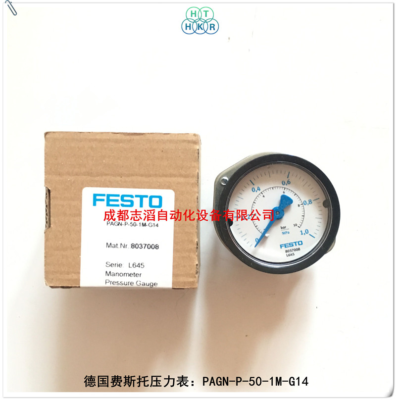 PAGN-P-50-1M-G14德国费斯托(FESTO)压力表技术参数简介:订货号为8037008、订货码为PAGN-P-50-1M-G14、安装类型为前面板安装、显示范围为1-10bar、气动连接口G1/4、测量精度等级2.5、产地为中国、应用在汽车气源处理单元压力显示!