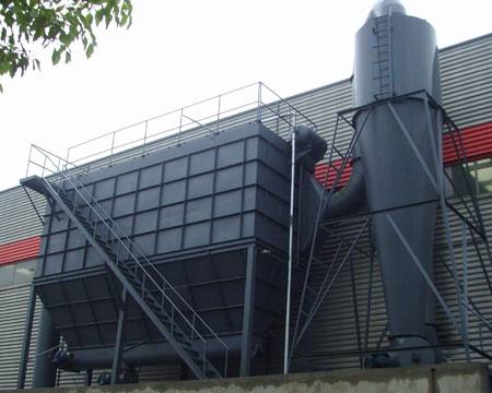 布袋除尘器是基于过滤原理的过滤式除尘设备,利用有机纤维或无机纤维过滤布将气体中的粉尘过滤出来。除尘的过程为含尘气体由进气口进入中部箱体,从滤袋外进入布袋内,粉尘被阻挡在滤袋外的表面,净化的空气进入袋内,再由布袋上部进入上箱体,后由排气管排出。布袋除尘器由除尘器出灰斗、进排风道、过滤室(中、下箱体)、清洁室、滤袋及框架(袋笼骨)、手动进风阀,气动蝶阀、脉冲清灰机构等组成。袋式过滤器是一种灰尘过滤装置,用于通过使用由纤维织物制成的袋式过滤器元件来收集含尘气体中的固体颗粒。当纤维缠绕在滤布上时,灰尘颗粒被惯性力拦截并与纤维碰撞,灰尘很细。