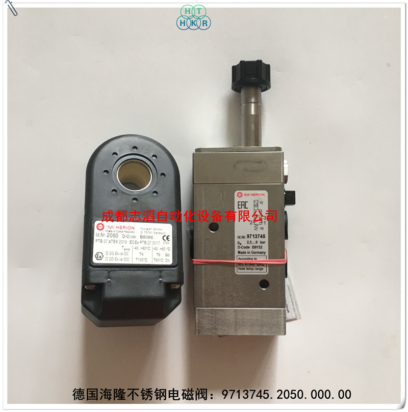 9713745.2050.000.00德国海隆(IMI HERION)不锈钢电磁阀参数简介:接口尺寸为1/4NPT、功能为3/2、工作方式电控/弹簧、Kv值为1.3立方米/h、阀体重量为1.1kg、产地为德国、配本安线圈2050.000.00(用于本安型电路的电磁线圈、防护等级EEx ia IICT5/T6,cat,II G,II2 D,IP66,T90,EC类检测认证KEMA 0. ATEX 1051X;线圈参数简介:线圈标称阻值200欧姆、切换电流33mA、线圈阻值240欧姆、终端电压RE60-8、温度范围-环境和流体T5为-40到80摄氏度,T6为-40到70摄氏度、线圈重量0.85kg、产地为德国)!应用在石化行业阀门控制